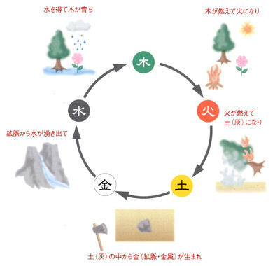 五行説では、自然界に存在する万物は「木」「火」「土」「金」「水」という5つの要素で成り立ち、すべてが5つのどれかに属するとされます。5つの要素はそれぞれ異なる特徴を持ち、お互いに影響し合っています。
