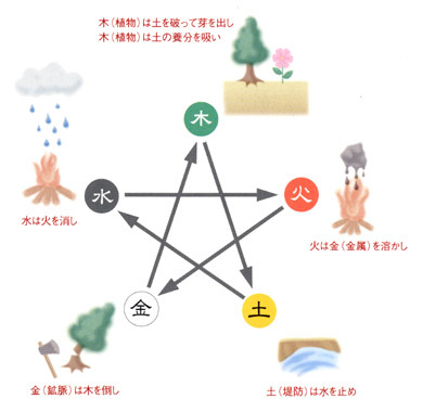 互いが助け合う関係が「相生」、互いに反発し合う関係が「相克」です。