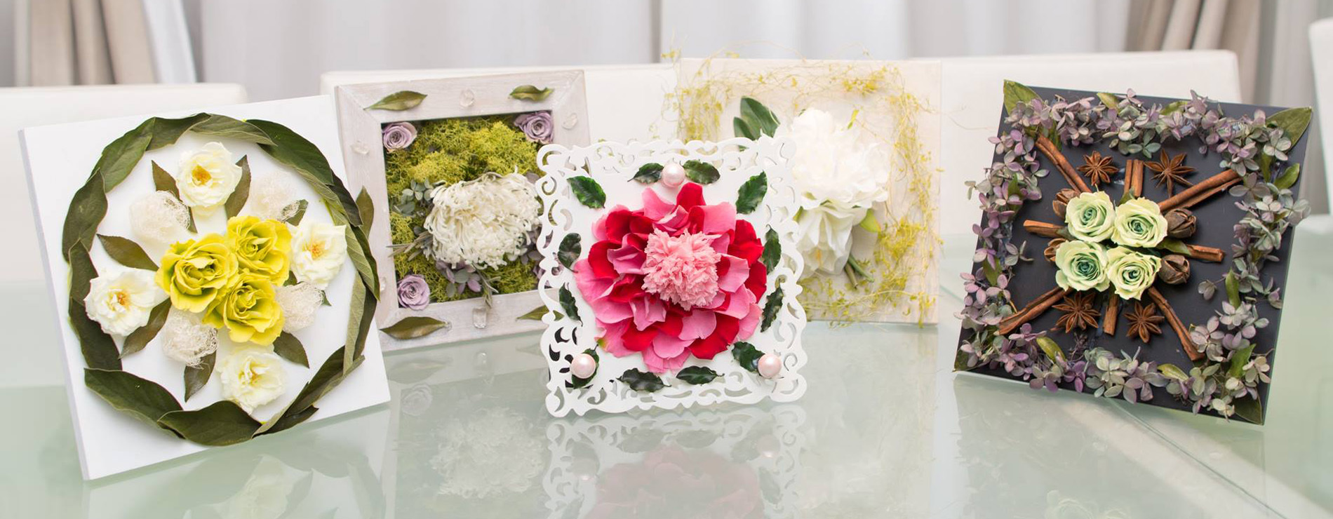 5つのフラワー風水アレンジメントを作りながら、プリザーブドフラワーの基本テクニックや風水についても同時に学べるコースです。